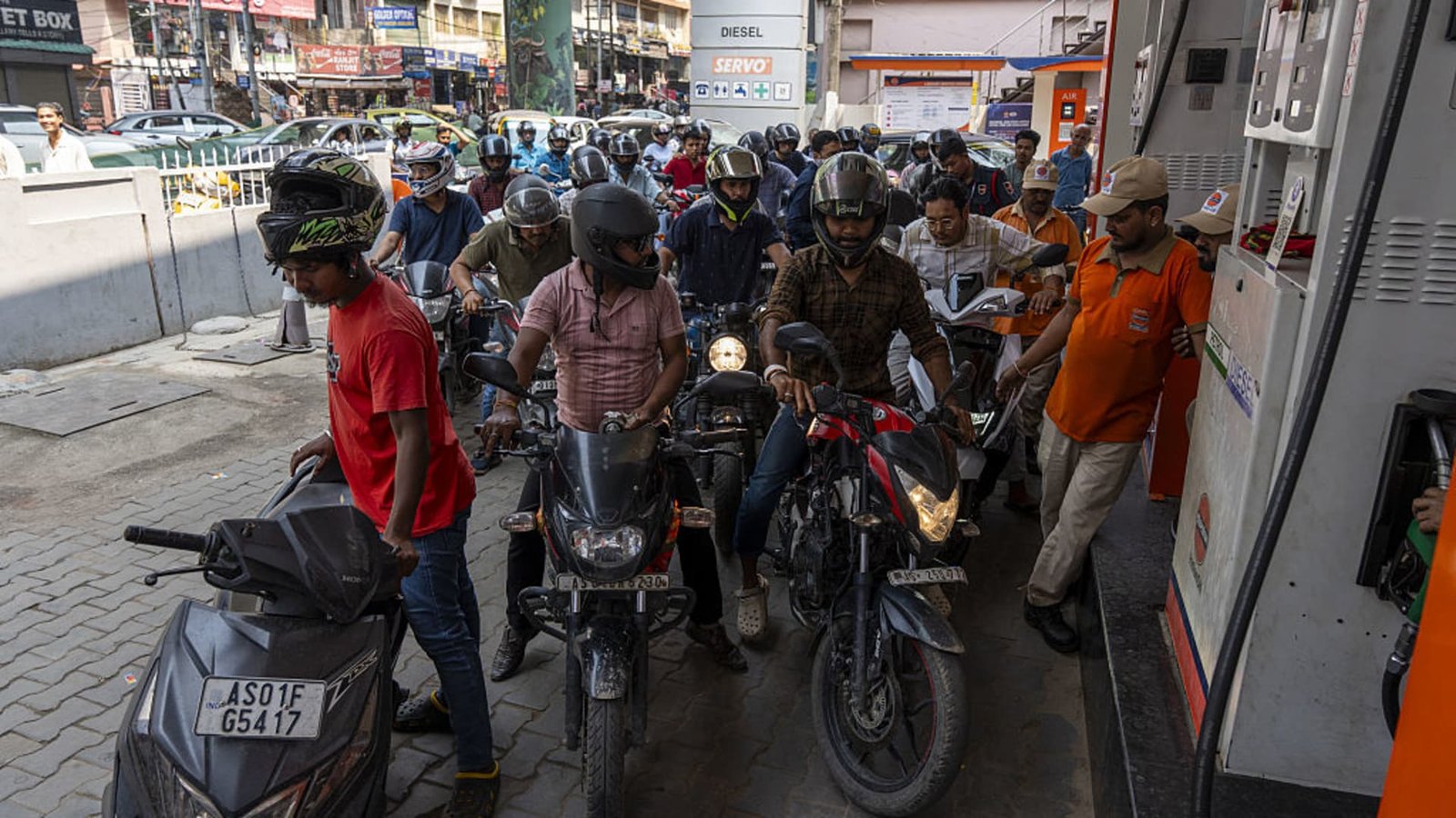 Cidadãos aguardam em fila para reabastecer combustível em um posto de gasolina em Guwahati, na Índia, no dia 26 de março de 2026.