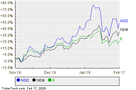 A New Gold Inc atua no setor de metais preciosos, entre empresas como Newmont Corp (NEM), que está em baixa de cerca de 3% hoje, e Barrick Mining Corp (B), que apresenta uma queda de aproximadamente 3,3%. Abaixo, é apresentado um gráfico histórico de preços nos últimos três meses, comparando o desempenho da ação da NGD com as de NEM e B.